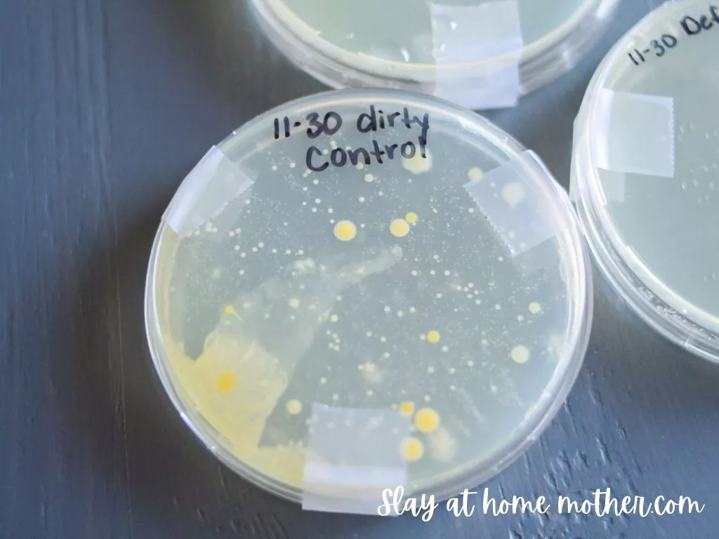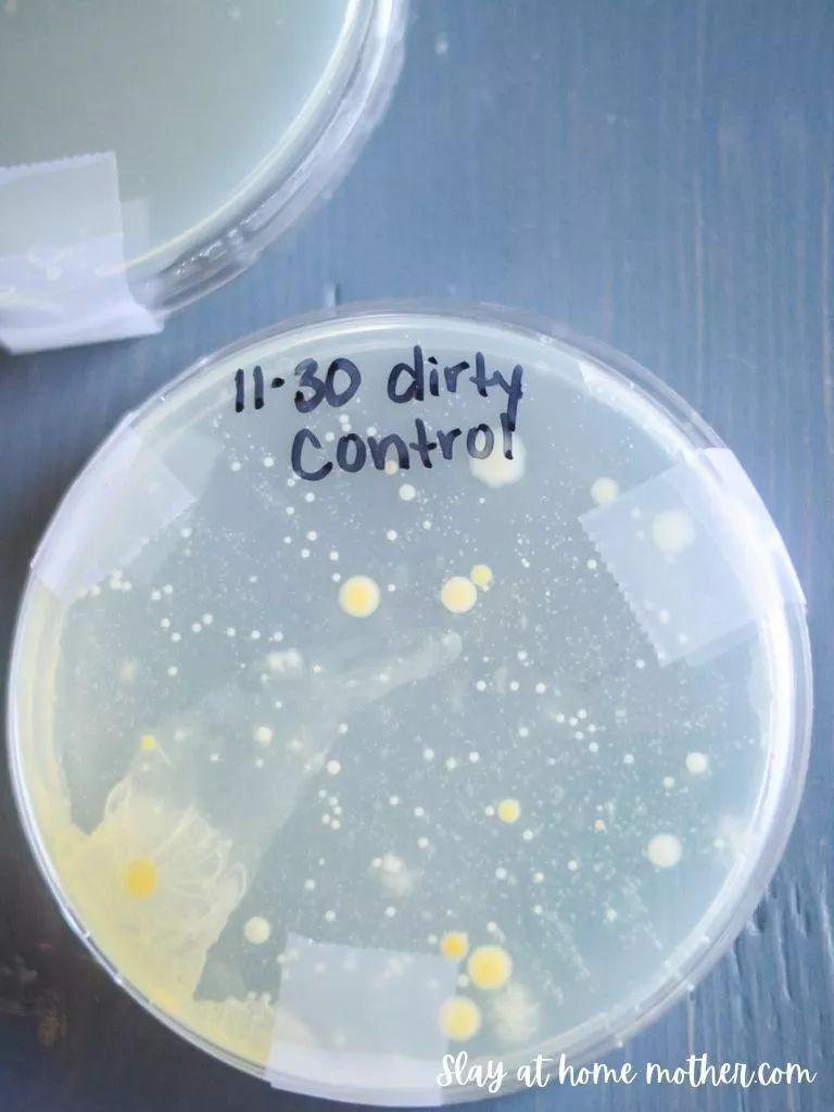 This plate is important because it ensures that the surface was dirty before I applied any cleaner. it’s also a great comparison to use to see how well a cleaner or disinfectant works against the bacteria on that surface.